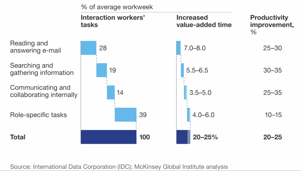 Duplicate research expenditures: A study by McKinsey found that employees spend 19% of their time searching for information or tracking down colleagues who can help with specific tasks. This often leads to repeating work that has already been done because previous findings weren’t accessible.