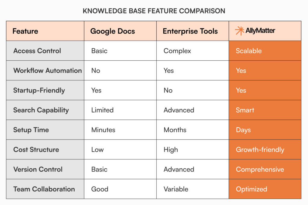 AllyMatter was specifically designed for growing startups that need sophisticated knowledge management without enterprise complexity. The platform provides advanced features like workflow automation, granular access controls, and comprehensive audit trails while maintaining the simplicity and speed that startups require.