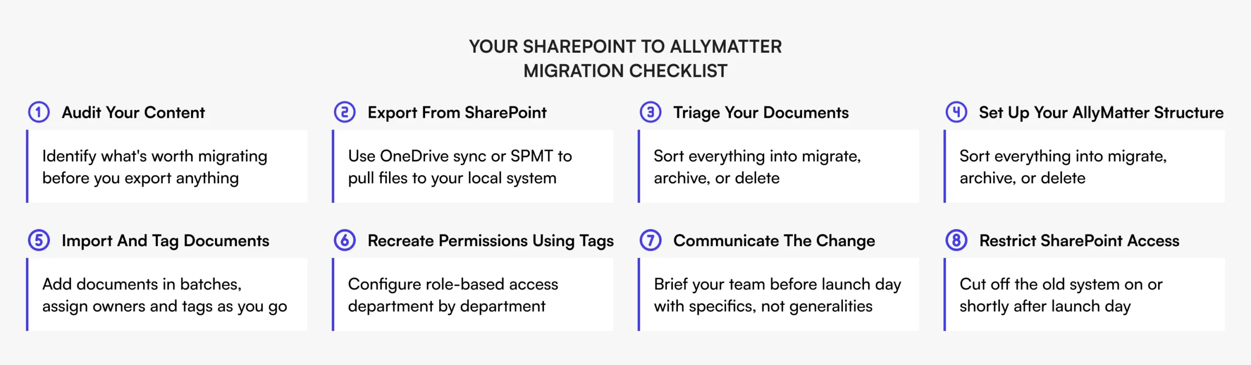 Moving your internal documentation from SharePoint to AllyMatter doesn’t require that kind of effort. If you’re methodical about what you migrate, set up AllyMatter properly from the start, and communicate clearly with your team, you can complete the transition in under a week.